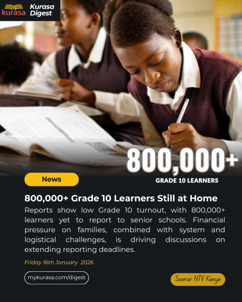 Education sector reports indicate a slow transition of Grade 10 learners to senior secondary school, with over 800,000 learners yet to report. Financial strain on households has emerged as a major factor, alongside system-related delays and logistical challenges linked to the new CBC transition structure.